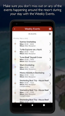 Blijf op de hoogte van het entertainmentprogramma van de week en mis geen enkel hoogtepunt van uw verblijf. Wilt u een dierbare verrassen met een speciaal evenement? Deze applicatie helpt u bij het regelen van die magische momenten. Bovendien biedt het u een helder overzicht van al uw uitgaven tijdens uw resortbezoek, zodat u altijd inzicht heeft in uw rekeningen. En wanneer de heimwee naar de paradijselijke stranden van Meeru Maldives toeslaat, kunt u met hetzelfde gemak uw volgende ontsnapping plannen en direct vanuit de applicatie reserveren. Ervaar de echte essentie van de Malediven, ondersteund door ongeëvenaard digitaal comfort.